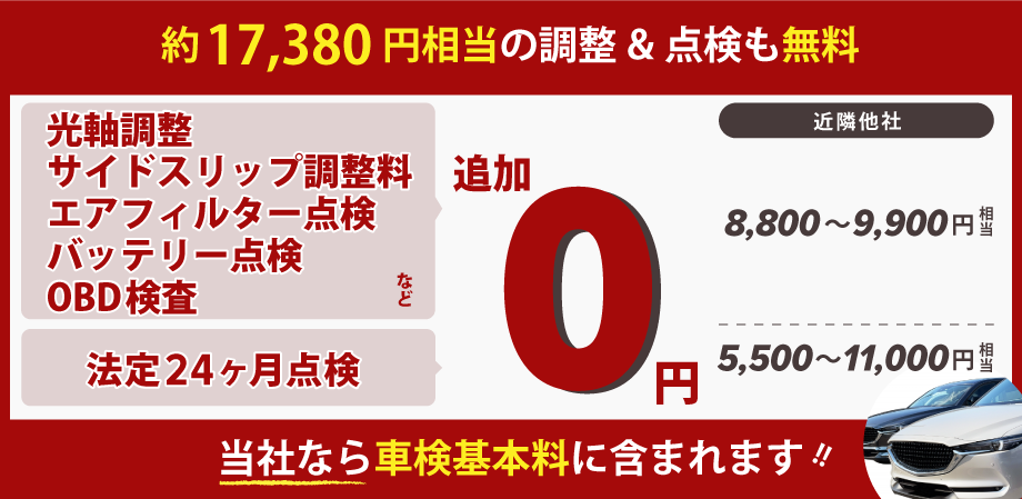 当店では上記のすべて、ホームページに記載してある車検基本料に含まれていますので、ご安心ください。